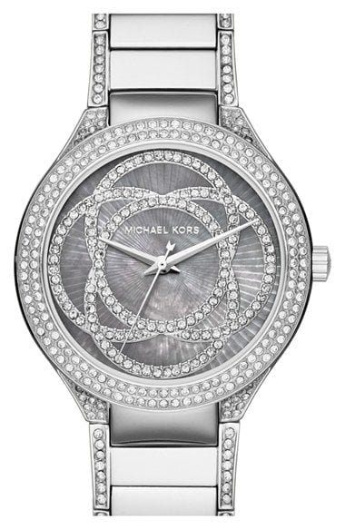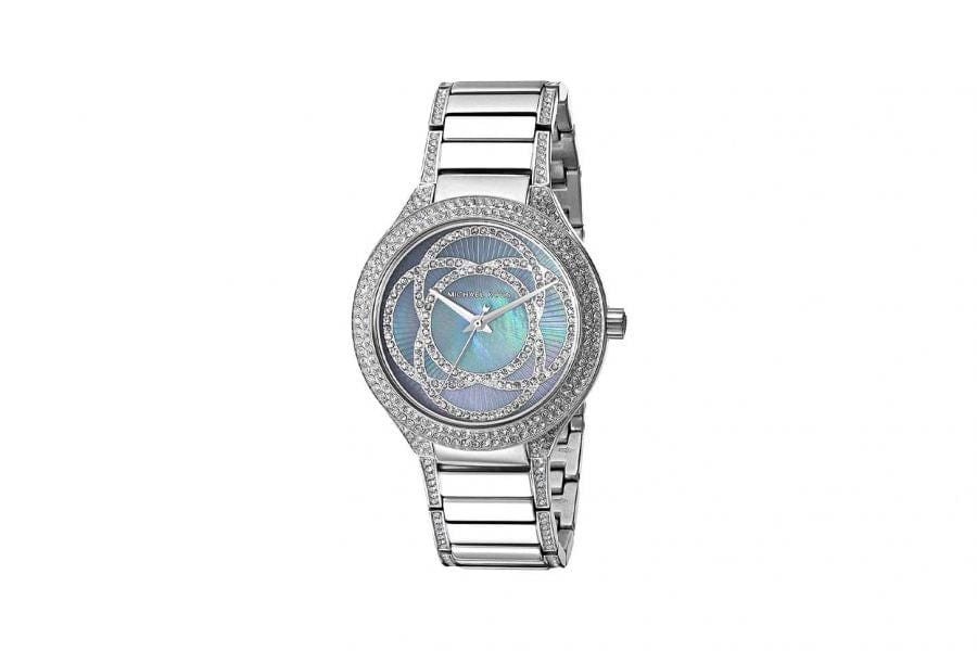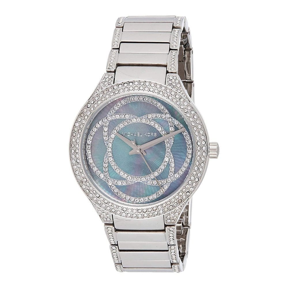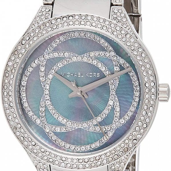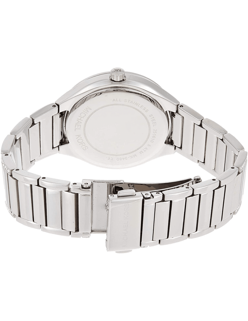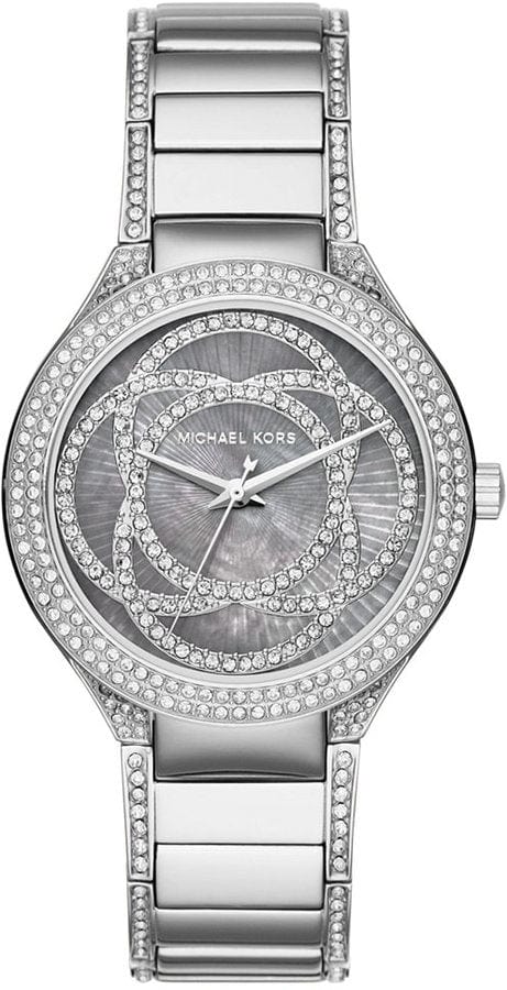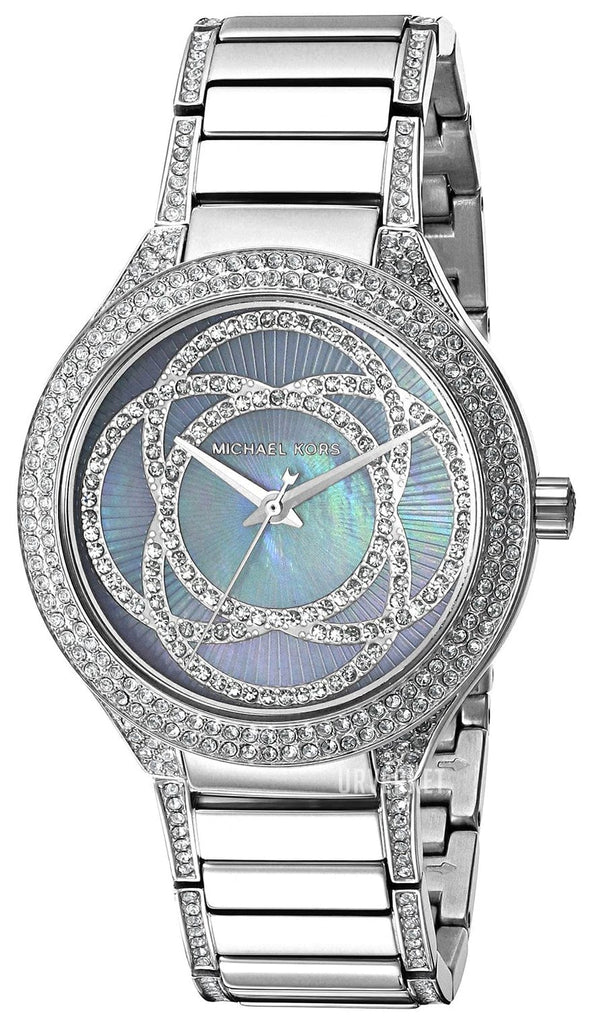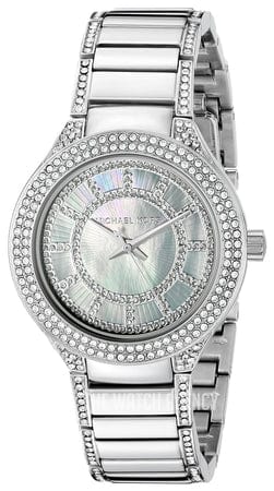 Stainless steel case with a stainless steel bracelet set with crystals. Fixed stainless steel bezel set with crystals. Mother of pearl crystal-set dial with silver-tone hands. Dial Type: Analog. Quartz movement. Scratch resistant mineral crystal. Pull / push crown. Solid case back. Case size: 38 mm. Round case shape. Band width: 20 mm. Deployment clasp. Water resistant at 50 meters / 165 feet. Functions: hour, minute, second. Additional Info: in general, suitable for short periods of recreational swimming, but not diving or snorkeling. Dress watch style. Michael Kors Kerry Mother of Pearl Dial Stainless Steel Ladies Watch MK3480.