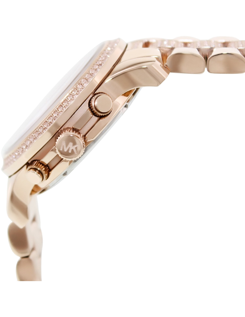Rose gold-tone stainless steel case with a rose gold-tone stainless steel bracelet set with crystals. Fixed rose gold-tone bezel set with crystals. Rose gold tone dial with gold-toned hands and alternating Arabic numeral and crystal-set index hour markers. Minute markers around the outer rim. Dial Type: Analog. Date display between 4 and 5 o'clock positions. Chronograph - three sub-dials displaying: 60 second, 60 minute and 24 hour. Quartz movement. Scratch resistant mineral crystal. Pull / push crown. Solid case back. Case diameter: 38 mm. Case thickness: 12 mm. Round case shape. Band width: 19 mm. Deployment clasp. Water resistant at 100 meters / 330 feet. Functions: chronograph, date, hour, minute, second. Dress watch style. Michael Kors Chronograph Dial Rose Gold-tone Ladies Watch MK5827.