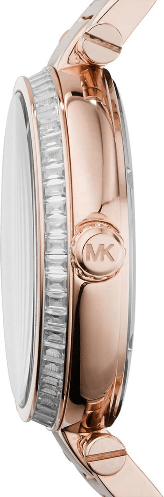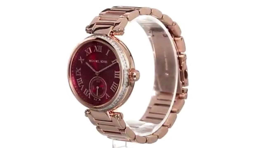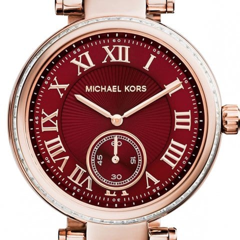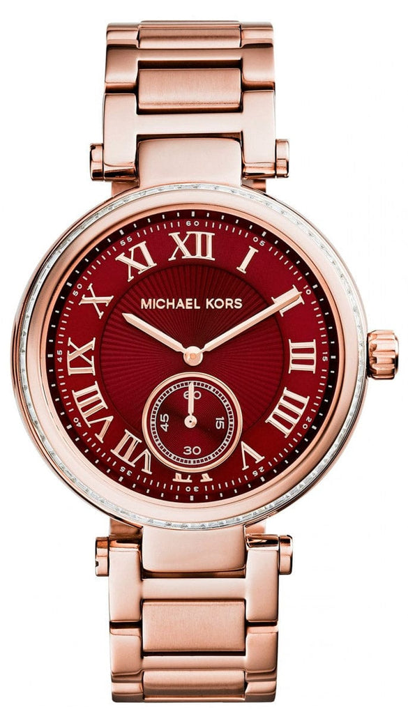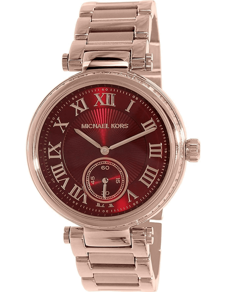 Rose gold-tone stainless steel case and bracelet. Fixed rose gold-tone bezel set with crystals. Red dial with rose gold-tone hands and Roman numeral hour markers. Minute markers around the outer rim. Dial Type: Analog. Small second sub-dial at the 6 o’clock position. Quartz movement. Scratch resistant mineral crystal. Pull / push crown. Solid case back. Case diameter: 42 mm. Case thickness: 12 mm. Round case shape. Deployment clasp. Water resistant at 50 meters / 165 feet. Functions: hour, minute, small second. Casual watch style. Michael Kors Skylar Red Dial Rose Gold Steel Ladies Watch MK6086.