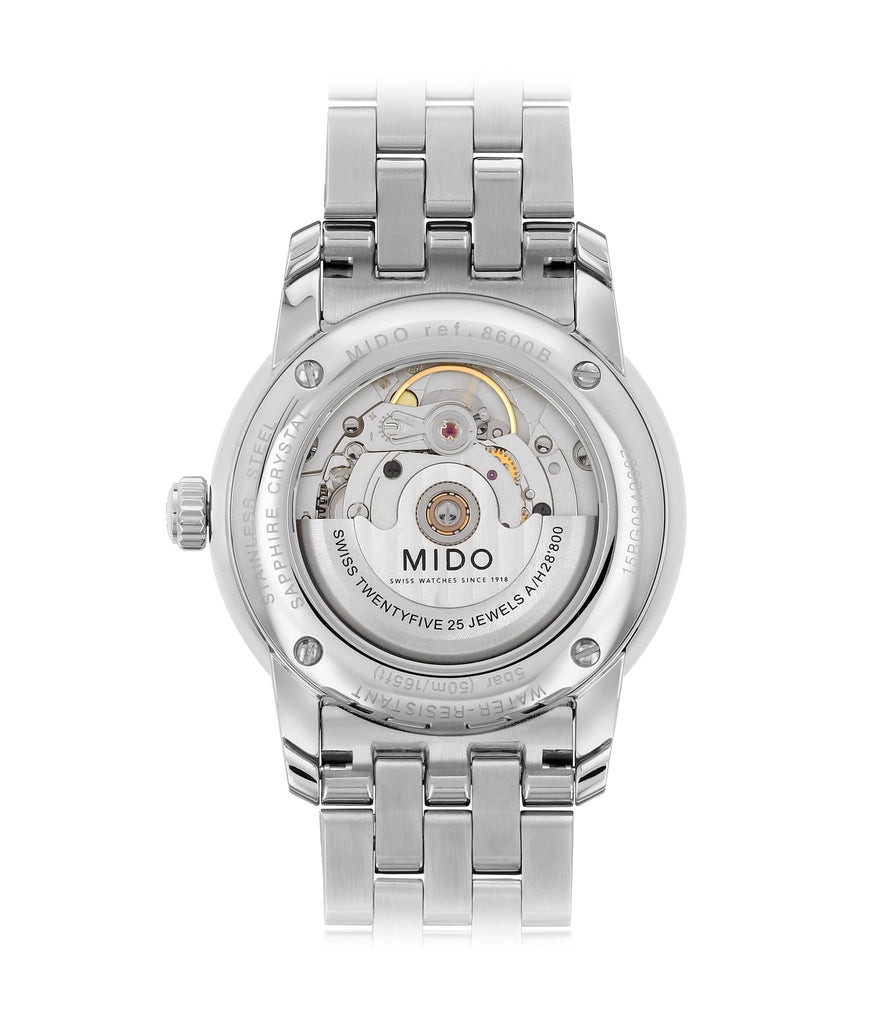 The Baroncelli Tradition Swiss watch honours MIDO's watchmaking heritage in its most timeless form. The harmonious lines and subtles curves bestow both a rare sense of elegance and tradition on this classical collection. Fitted with latest-generation technology, the automatic movement can be admired through the transparent case back.