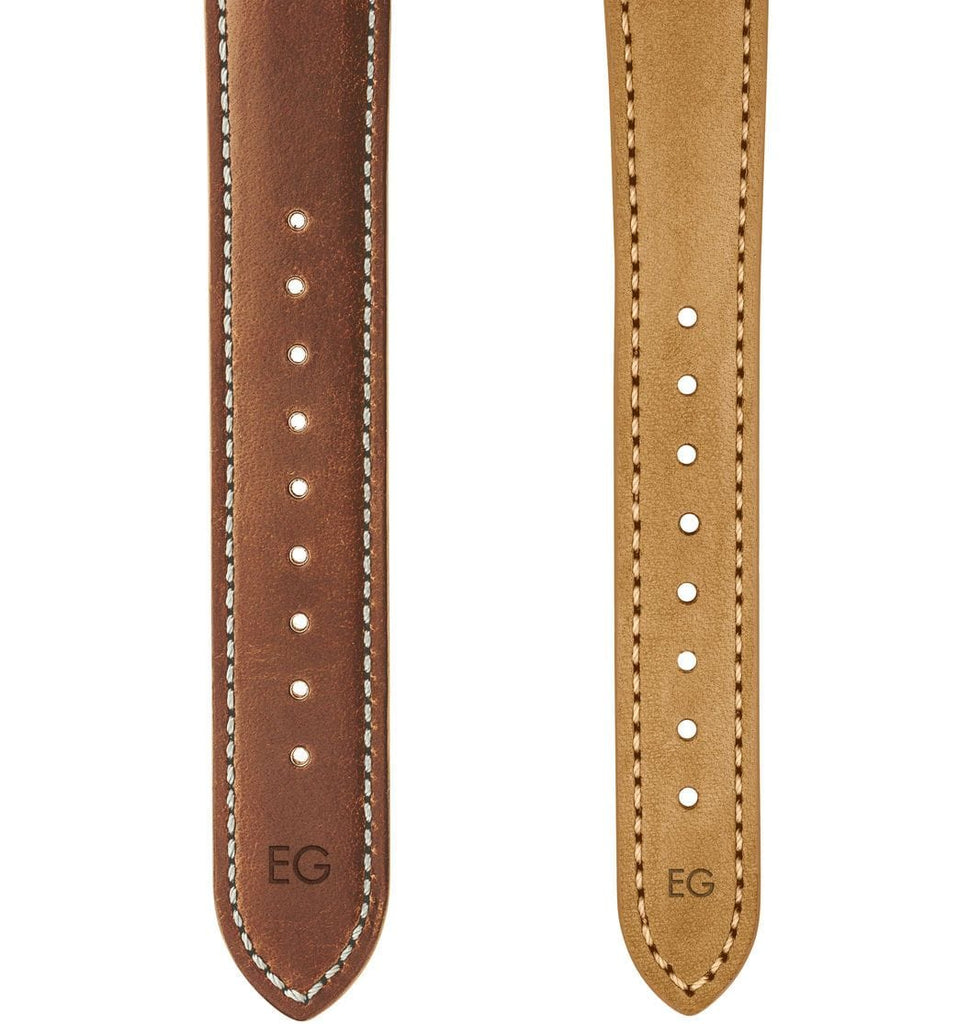Yellow gold ion-plated stainless steel case with a cognac leather strap. Uni-directional rotating yellow gold ion-plated bezel with a green aluminum ring. Green dial with luminous yellow gold-tone hands and index hour markers. Minute markers around the outer rim. Dial Type: Analog. Luminescent hands and markers. Date display above the 6 o’clock position. Chronograph – three sub-dials displaying: 60 seconds, 30 minutes,s and 12 hours. Quartz movement. Scratch-resistant sapphire crystal