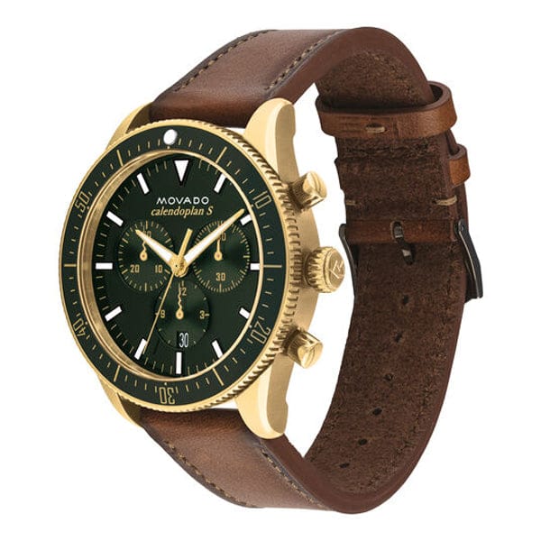 Men’s Movado Heritage Series Calendoplan S chronograph watch, 42 mm yellow gold ion-plated stainless steel case with fluidly extended lugs, yellow gold ion-plated stainless steel and green aluminum bezel, green dial with matching date display and subdials, luminescent/gold-toned hands and applied markers, and printed yellow gold-toned minute index; cognac leather strap with top-stitching and yellow gold ion-plated classic stainless steel buckle.