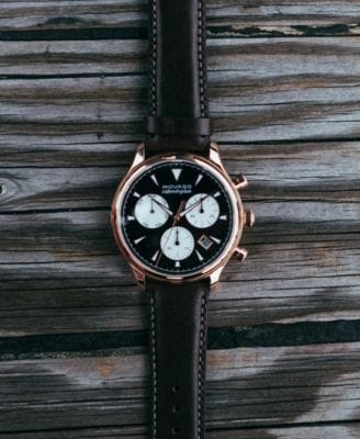 - QUALITY MATERIALS, ICONIC STYLE: 43mm rose gold plated stainless steel case, black lacquer dial with white subdials and date display, chocolate leather strap. Water resistant to 3 ATM.