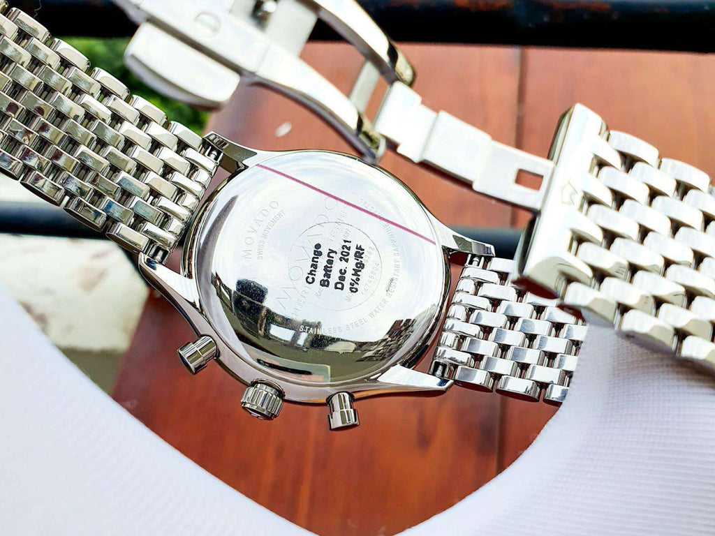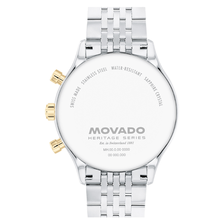 Movado Heritage Black Dial Stainless Steel Men's Watch 3650014. 43 mm silver stainless steel case with a black dial, a scratch resistant sapphire crystal, and luminous silver tone hands and index hour markers. Hands: hours, minutes, and seconds. Minute markers around the rim. Day and date functions. Chronograph. Case thickness of 12 mm. Push / pull crown. 21 mm silver stainless steel band with a deployment clasp. Quartz movement and water resistant up to 30 meters. Heritage series.