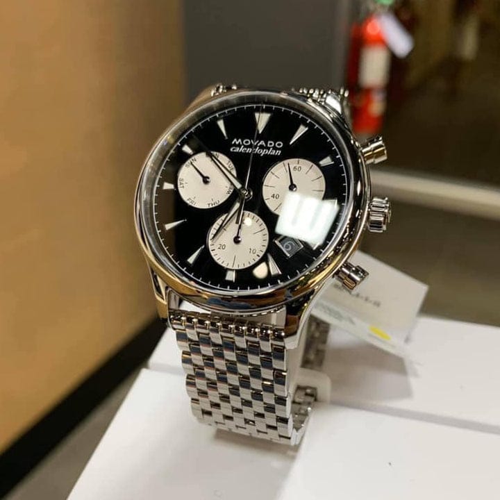 Movado Heritage Calendoplan Chronograph Black Dial Silver Steel Strap Watch for Men - 3650014