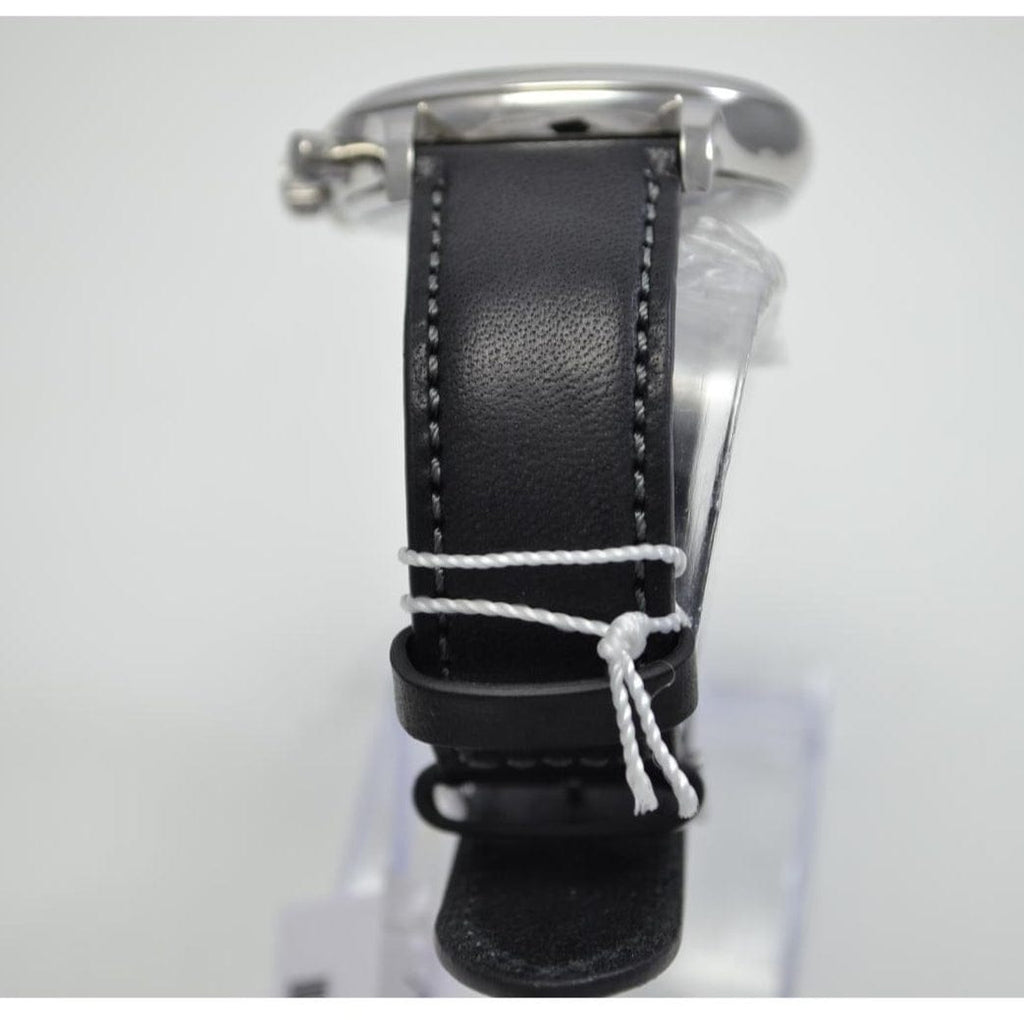Stainless steel case with a black leather strap. Fixed stainless steel bezel. Black dial with silver-tone hands and index hour markers. Minute markers around the outer edge. Dial type: analog. Luminescent needles and markers. Date display between the 4 and 5 o'clock positions.