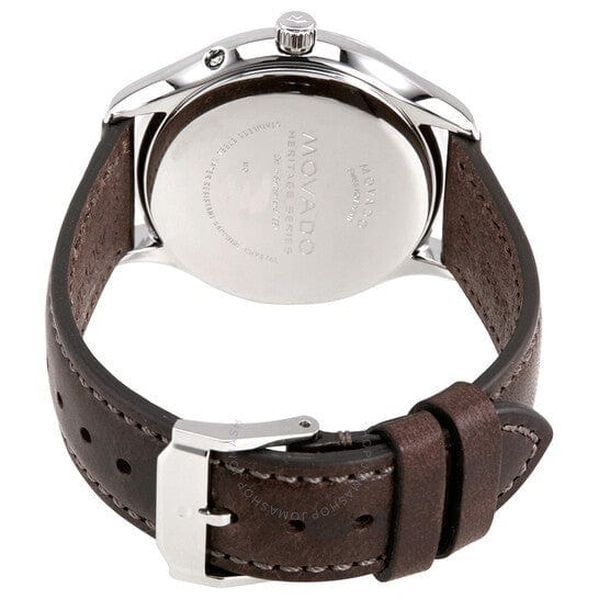 Silver-tone stainless steel case with a brown leather strap. Fixed silver-tone stainless steel bezel. Navy dial with luminous silver-tone hands and index hour markers. Minute markers around the outer rim. Dial Type: Analog. Luminescent hands and markers. Date display at the 3 o'clock position. Three - date, day of the week and moonphase subdials. Quartz movement. Scratch resistant sapphire crystal. Pull / push crown. Solid case back. Round case shape, case size: 36 mm, case thickness: 9.48 mm. Band width: 18 mm. Tang clasp. Water resistant at 30 meters / 100 feet. Functions: date, day, hour, minute, second, moonphase. Additional Info: in general, withstands splashes or brief immersion in water, but not suitable for swimming or bathing. Casual watch style. Watch label: Swiss Movt. Movado Heritage Moonphase Navy Dial Ladies Watch 3650009.