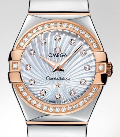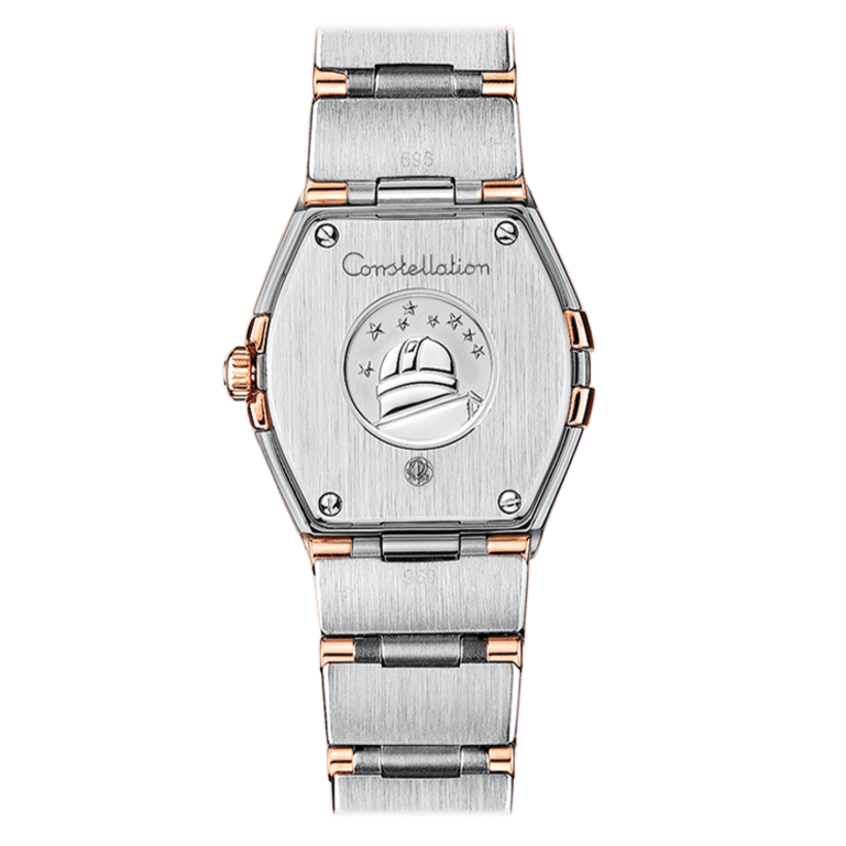 The striking design of the OMEGA Constellation has stood the test of time. Its characteristic feature is the famous brackets on the sides of the watch case and impressive dials. The nobility of the white mother-of-pearl dial with Supernova pattern and diamond hour markers, protected by a scratch-resistant sapphire crystal with anti-reflective coating. An 18k rose gold bezel set with diamonds is set on a 27mm stainless steel case. Bracelet in stainless steel and 18k rose gold. This watch uses a high-precision OMEGA quartz movement, caliber 1376.
