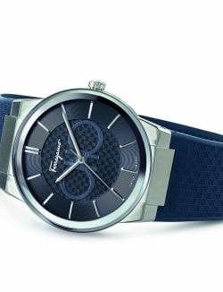 Ferragamo Sapphire stands out for its new aesthetics, featuring a sapphire glass that covers the whole dial and the top ring alike, creating the effect of a unique layer. The checked patterned 41 mm dial with Double Gancini logo and checked patterned strap, deployment buckle with Ferragamo logo completes the look. The Swiss Made watch comes with three hands and quartz movement.
