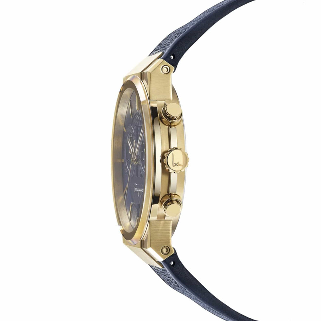 Due to its great success, the outstanding watch collection Ferragamo Sapphire is reinvented with an intricate chronograph movement. The sapphire glass covers the dial and top ring creating a stunning, unique layer. For this new collection, the Double Gancini logo is represented on the dial along with the chrono counters bestowing a sporty yet luxurious touch to this successful timepiece collection.