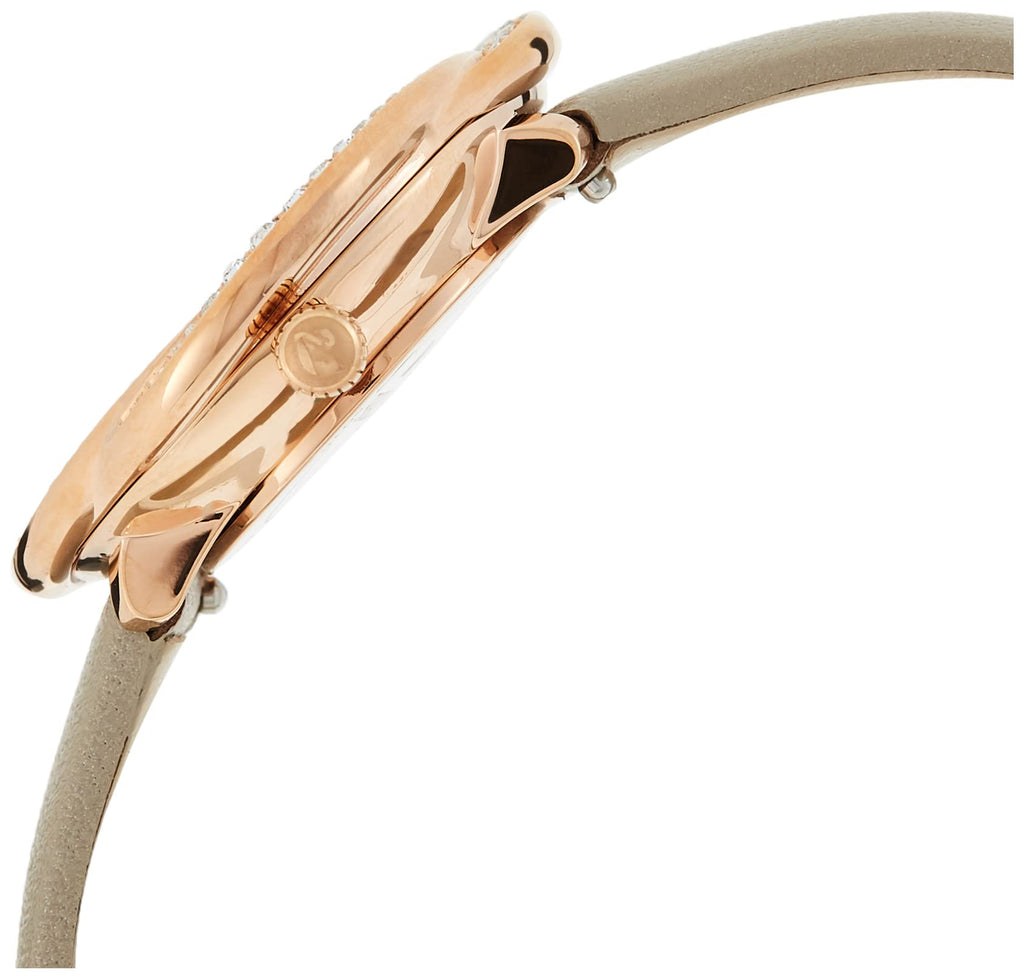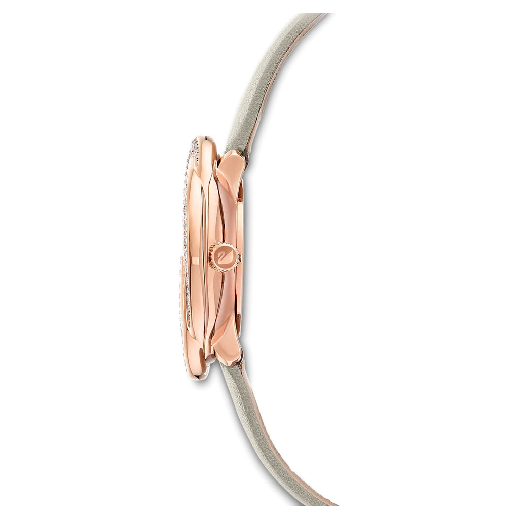 This Swarovski timepiece combines natural shapes with contemporary design. Flowers inspired us to create them. The rose gold tone PVD bezel is adorned with two intertwining rows of brilliantly shining crystals. These sparkling lines frame a gray sunray dial with crystal hour markers and the Swarovski logo at 12 o'clock. A gray genuine leather strap completes the design of this Swiss Made watch. This floral watch will be a bright, incredibly romantic accent to your everyday look.