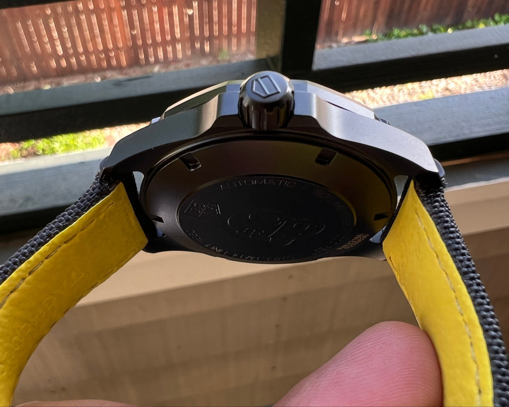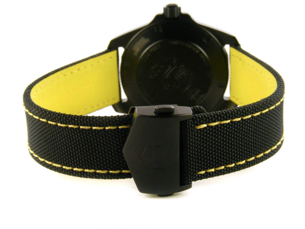 Sandblasted black titanium case with a black nylon bracelet. Unidirectional rotating titanium bezel. Black dial with luminous hands and index hour markers. Minute markers around the outer rim.