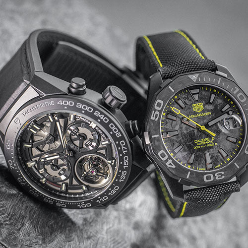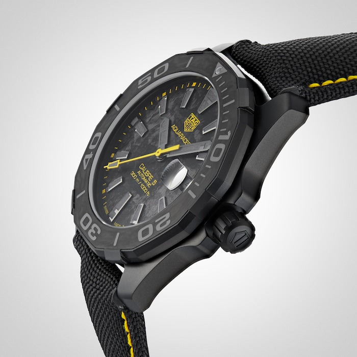 The TAG Heuer Aquaracer Carbon draws the eye with its 41-mm-diameter, black PVD-coated titanium case and imitation carbon-printed dials, which are highlighted with hints of blue, yellow, or rose gold depending on the model. The carbon material used for the watch’s unidirectional divers’ bezel is created by a random injection of carbon fibers into a resin pressed at high temperatures to achieve the black-and-gray marbled motif that differs slightly on each finished component, essentially making each watch in this collection a unique piece. The use of grade 5 titanium, with matte black PVD coating, as the case material means that the timepieces are as durable and scratch-resistant as they are lightweight, in addition to being water-resistant to 300 meters.