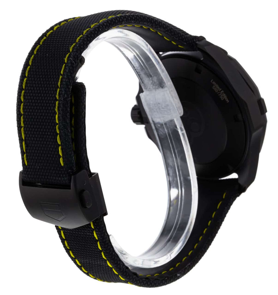 The watches are equipped with TAG Heuer’s automatic Caliber 5, based on the ETA 2824-2 and possessing a 42-hour power reserve, and mounted on black nylon straps with contrast topstitching that matches the colored highlights of each model’s dial. A folding buckle in black PVD-coated grade 2 titanium, with a double safety push-button closure and a divers’ extension, completes the picture. Available as of September 1, 2018, the Aquaracer Carbon models (whose prices were not available at press time) will be sold exclusively at TAG Heuer boutiques and at www.tagheuer.com.