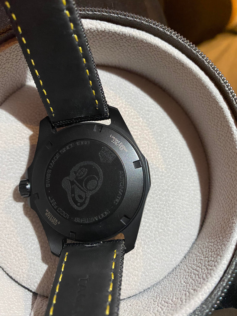 The bezel combines carbon and matte black PVD-coated steel, and is inscribed with the 60-minute scale characteristic of the Aquaracer and most of its dive-watch brethren. The screw-down crown at 3 o’clock is also made of matte-black steel, while the screw-on caseback is in PVD-coated titanium. The faceted indices and hour and minute hands are are polished and lacquered in rose gold, on the model pictured above, or plated with black gold, on the yellow- and blue-highlighted models, below, and treated with gray Super-LumiNova. The date window at 3 o’clock features a magnifying lens for easy reading in the depths or in the other low light conditions.