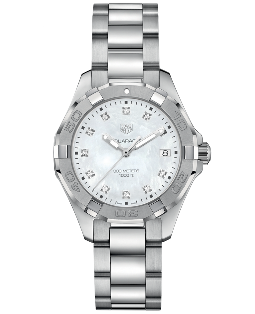 Allowing you to keep track of time in style, this TAG Heuer Aquaracer timepiece features a striking mother-of-pearl dial equipped with sparkling diamond dot hour markers, a date display window at 3 o’clock, and luminous hands for optimum visibility all conditions.