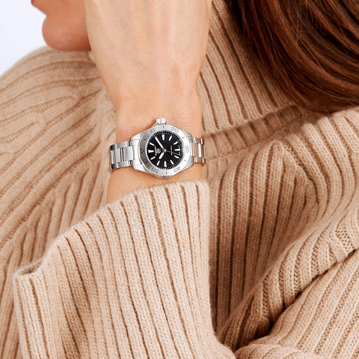 Go anywhere in style with the TAG Heuer Aquaracer. This 30mm steel model has refined details and combines versatile looks with technical design codes and extreme engineering, making it an essential ally in your achievement.