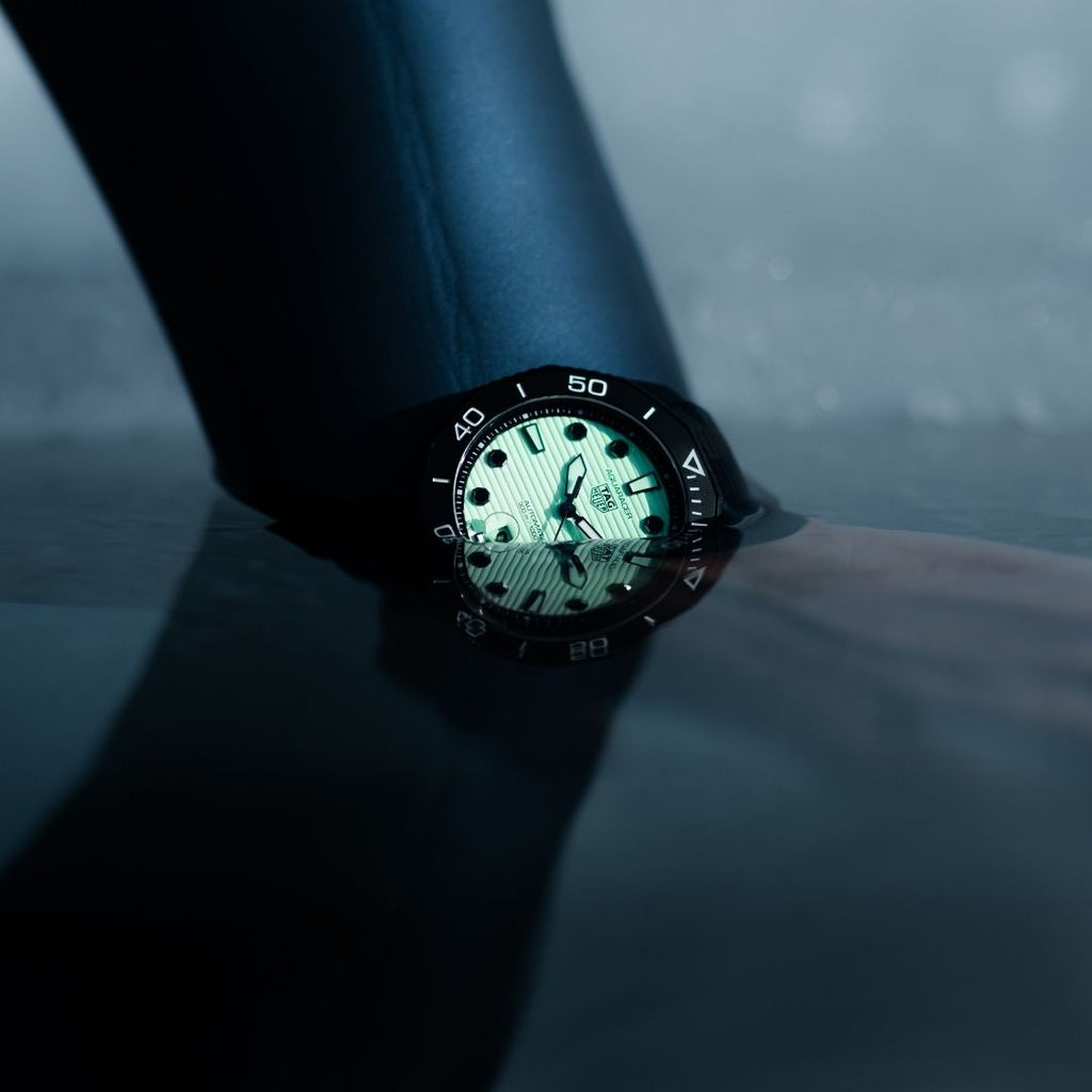 A perfect match to the black DLC case, the white luminescent dial transforms the watch in the dark. A nod to Heuer’s glowing dials from the 1980s.