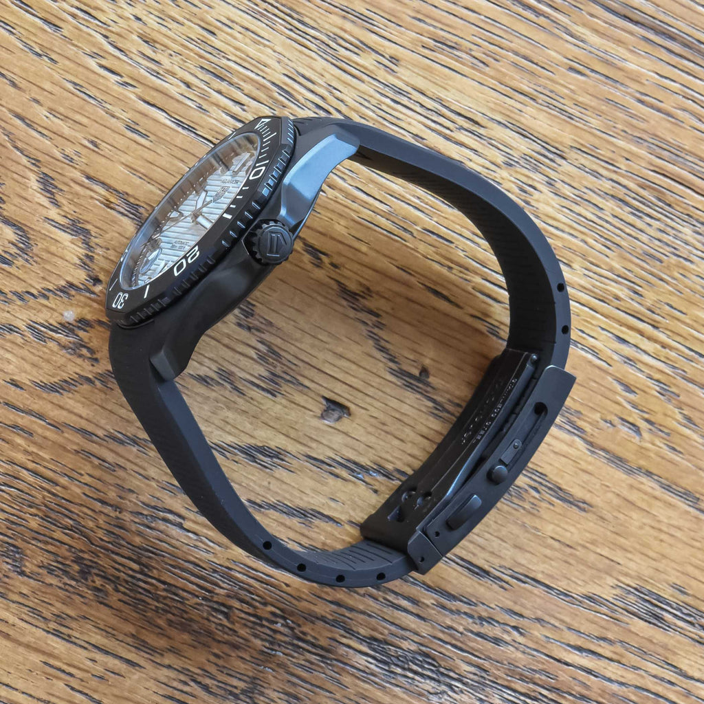 Pressure proof and comfortable, a black refined rubber strap with steel DLC buckle and fine adjustment system secures this dive-ready Aquaracer.