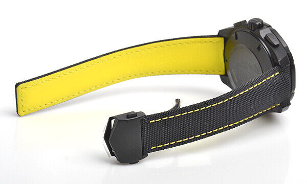 Tag Heuer AQUARACER CALIBRE 16 Black Dial Sandblasted black titanium Black Nylon Strap CAY218A.FC6361. Black coated titanium case with a black textile strap (yellow backed). Uni-directional rotating black coated titanium bezel with a black ceramic top ring. Black dial with luminous silver-tone hands and index hour markers. Minute markers around the outer rim. Luminescent hands and markers.