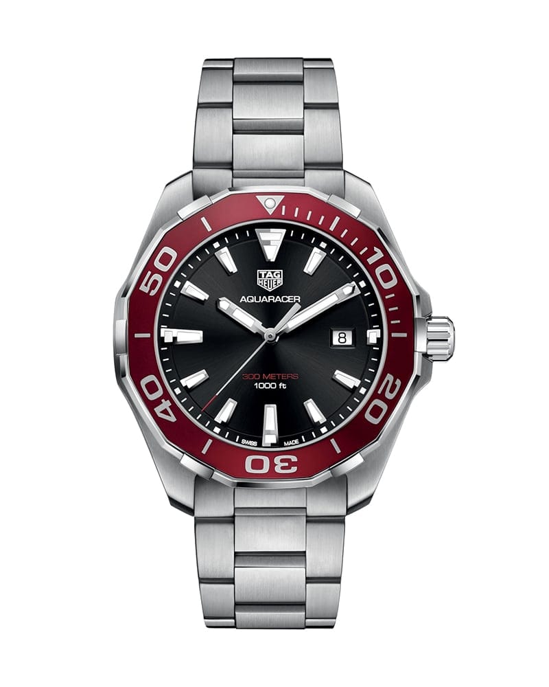 Swiss-made, this bold TAG Heuer Aquaracer is an aesthetic 43 mm watch. This model features a Steel case and a Quartz movement.