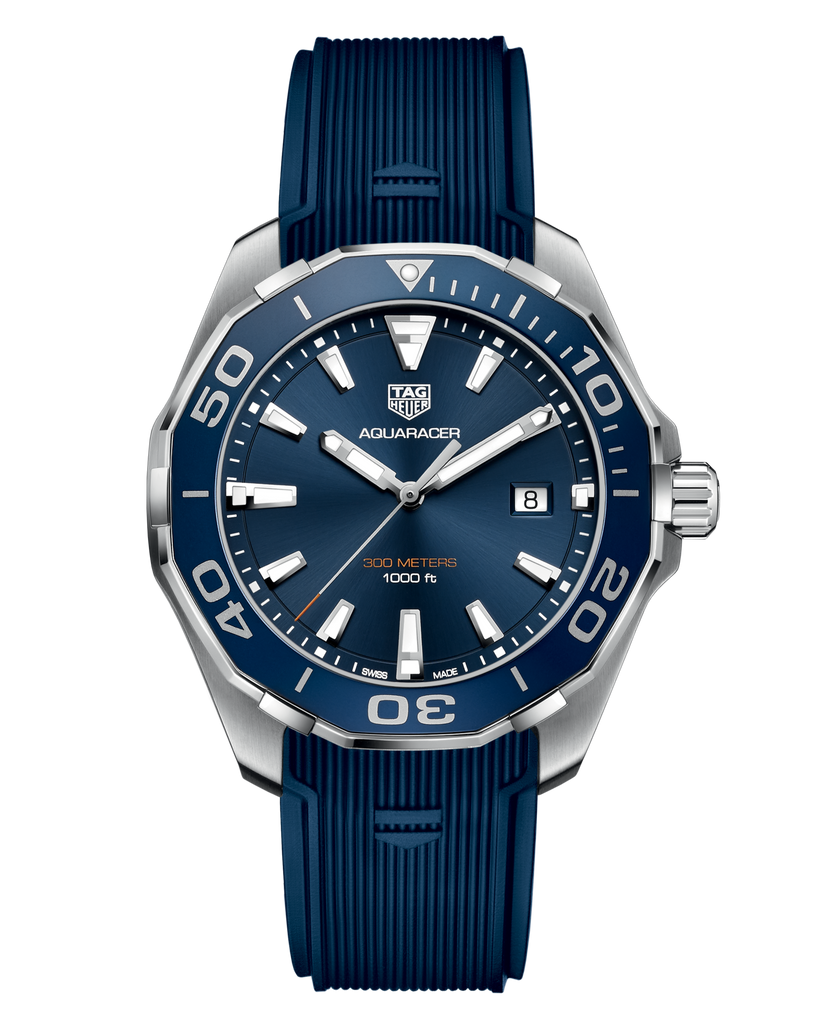 Flat and anti-reflective sapphire crystal protects the blue opalin dial that's enhanced by the blue flange, rhodium plated, polished and applied hour markers and hands with white superluminova, finished with a date window at 3 o'clock. Water resistant to an impressive 300m, this watch is powered by a Swiss made quartz movement. Whether you're in or out of the water, this TAG Heuer Aquaracer will be the perfect choice for every occasion. WAY101C.FT6153