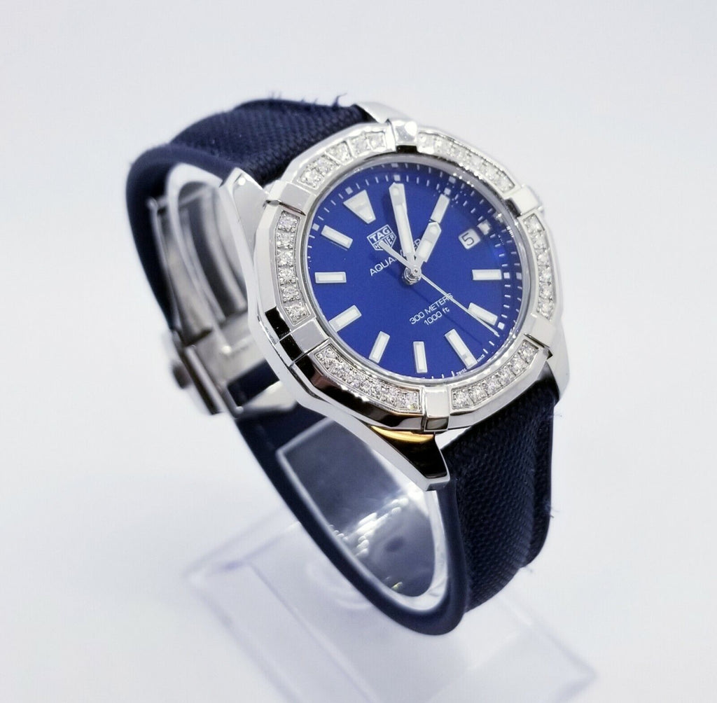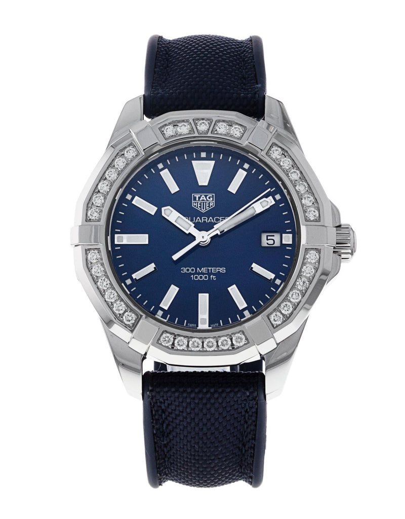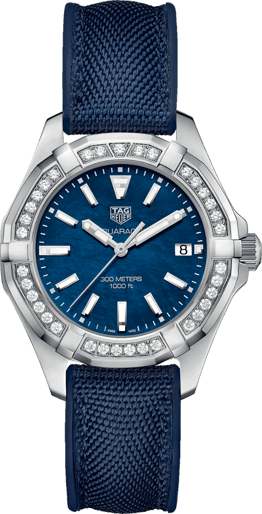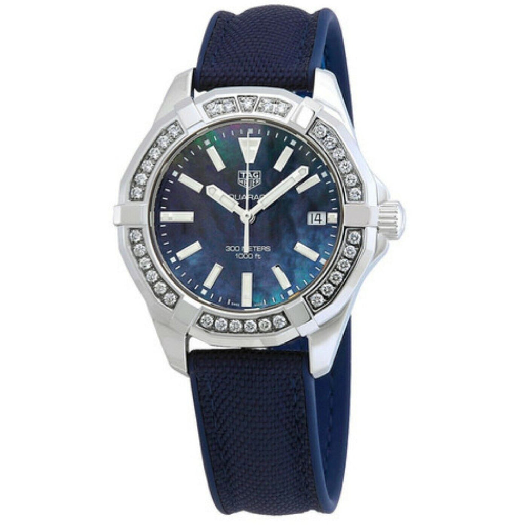 TAG Heuer Aquaracer Quartz 35 mm watch. Model reference: WAY131N.FT6091. Stainless steel case set with diamonds. Blue mother-of-pearl dial. Quartz movement. Blue fabric strap with rubber inner lining. Swiss made. The watch comes in the original packaging, with a set of documents and 2 years warranty.Brand | Tag Heuer |