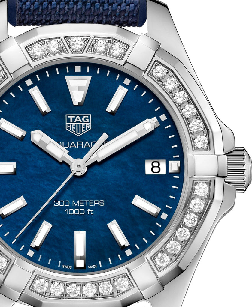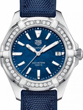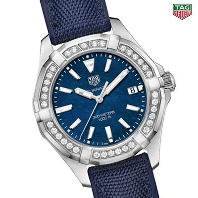 TAG Heuer Aquaracer Quartz 35 mm watch. Model reference: WAY131N.FT6091. Stainless steel case set with diamonds. Blue mother-of-pearl dial. Quartz movement. Blue fabric strap with rubber inner lining. Swiss made. The watch comes in the original packaging, with a set of documents and 2 years warranty.| Brand | Tag Heuer |