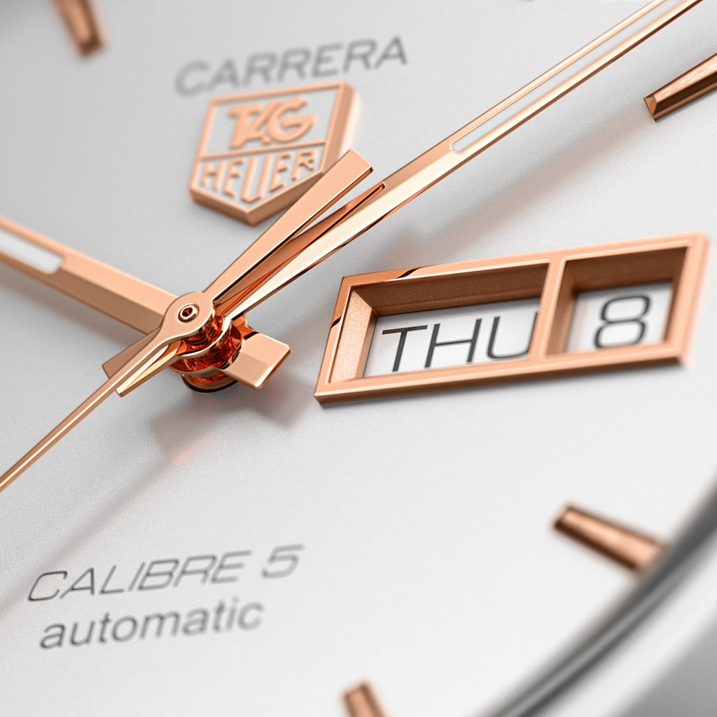 A stainless-steel watch with rose-gold plated detailing on its white dial. Powered by the robust Calibre 5 automatic movement, it comes on a steel bracelet fixed to the 41mm steel case by the iconic lugs of the TAG Heuer Carrera collection.