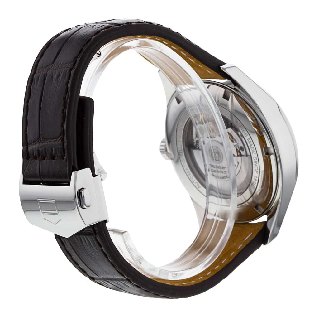 The Tag Heuer Carrera Calibre 5 WAR201D.FC6291 has an automatic movement with 38 hours of Power Reserve, 10 Bar (100 meters) of water resistance, Stainless Steel case material, Leather strap and Grey dial color and a day-date window at 3 o'clock position.