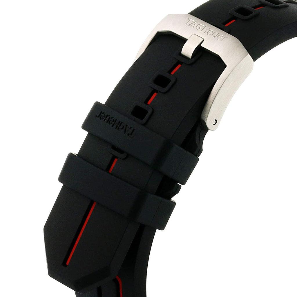Black Opalin dial enhanced by luminous gunmetal hands. Black PVD stainless steel case with a black and red bi-injection rubber band. Quartz movement. 200 meters / 660 feet water resistance. Fixed bezel. Scratch Resistant Sapphire crystal. Solid caseback. Tang clasp. Screw Down crown. Case size 43 mm. Band 22 mm x long. Tag Heuer CAZ101J.FT8027 Formula 1 Watch.