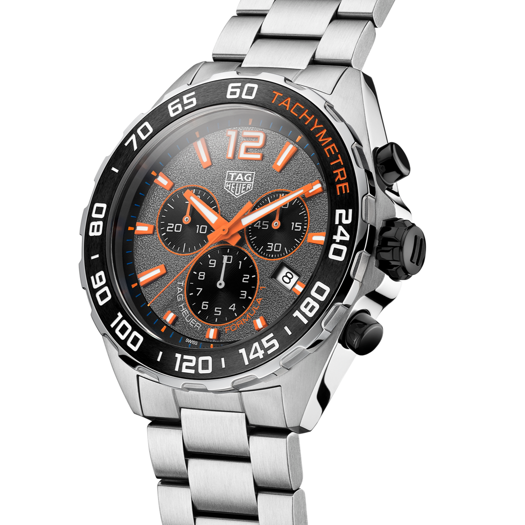 Adorned with a chequered flag caseback, a reliable Swiss made quartz movement is sealed behind a strong piece of steel and powers on relentlessly. The TAG Heuer Formula 1 watch measures a confident 43mm diameter and features a fixed black ceramic bezel with vibrant orange accents marking out its tachymeter scale.