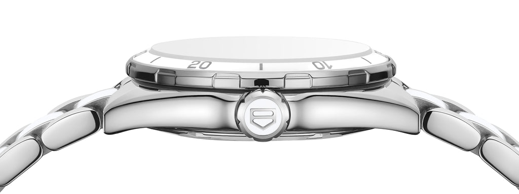Instantly noticeable, the striking white dial of this TAG Heuer Formula 1 Ladies watch is decorated with the brand’s famous logo at 12 o clock, diamond dot indices and sleek steel hands. The neatly sized 32mm fine brushed and polished stainless steel case is water resistant to 100 metres and moulds elegantly to the wrist thanks to the sleek lugs and sophisticated two toned white ceramic and stainless steel bracelet.