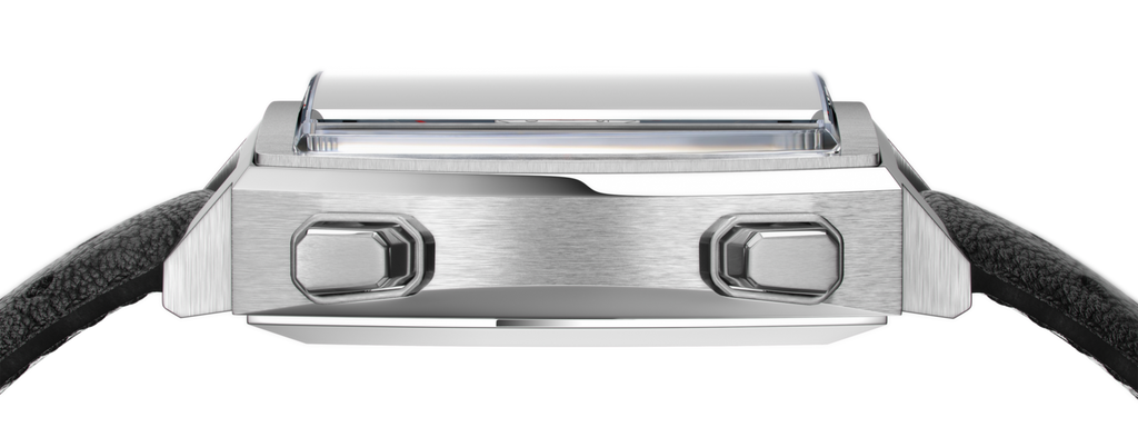 - Statement 39mm steel case with a black leather strap inspired by race tracks