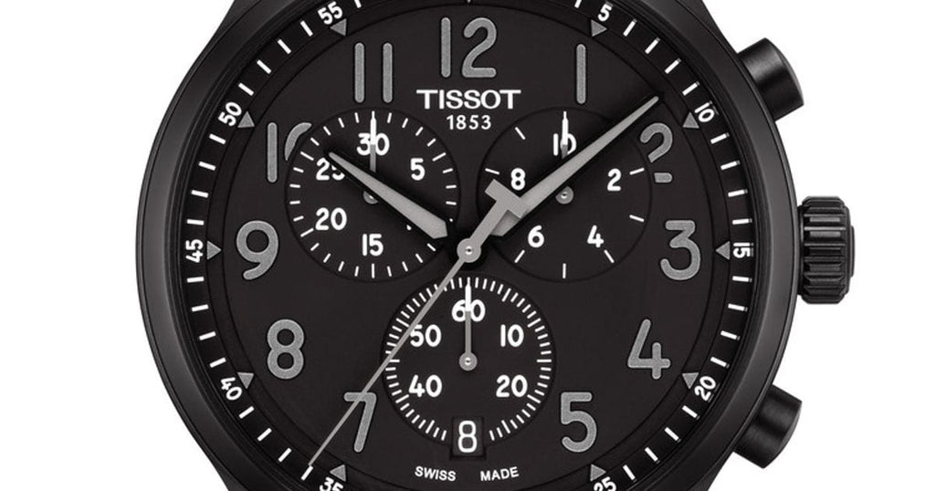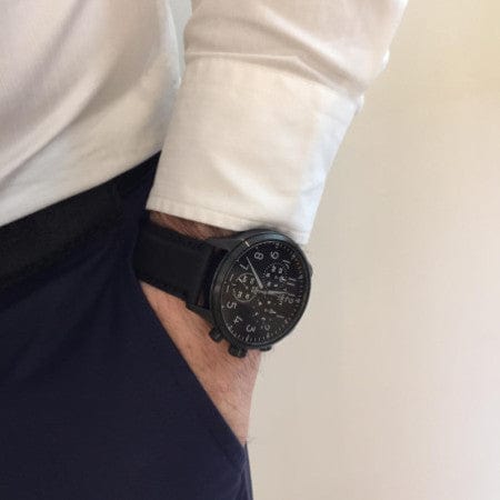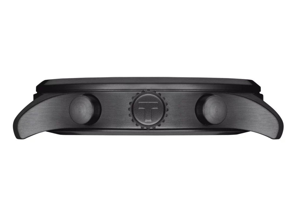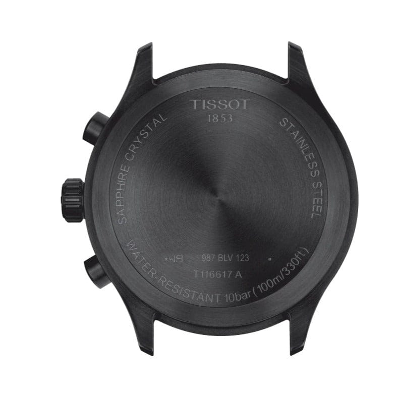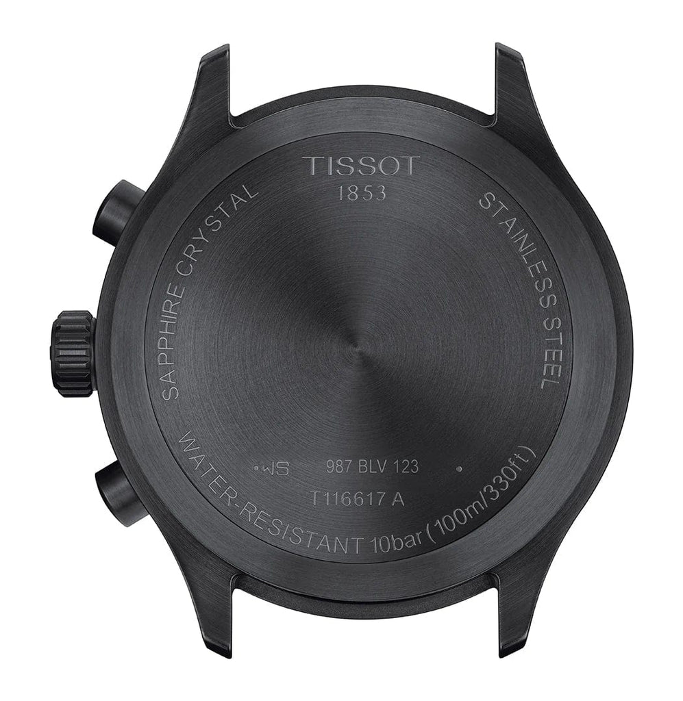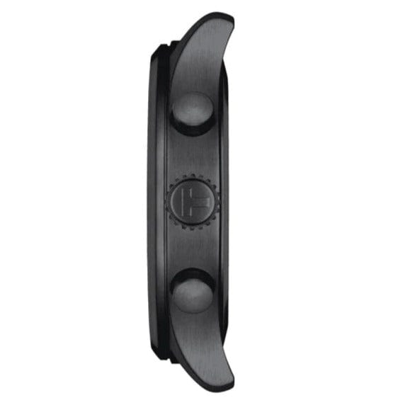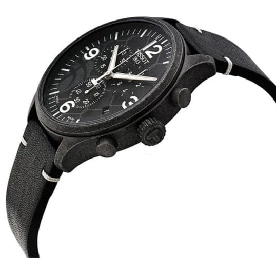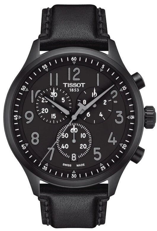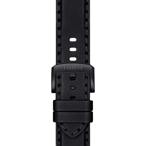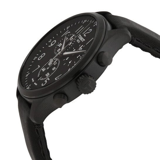 The Tissot T116.617.36.052.00 watch combines a black 45mm round shaped stainless-steel case and black leather strap with a traditional buckle. It has a black analogue dial with two black luminescent hands and a second tracker.