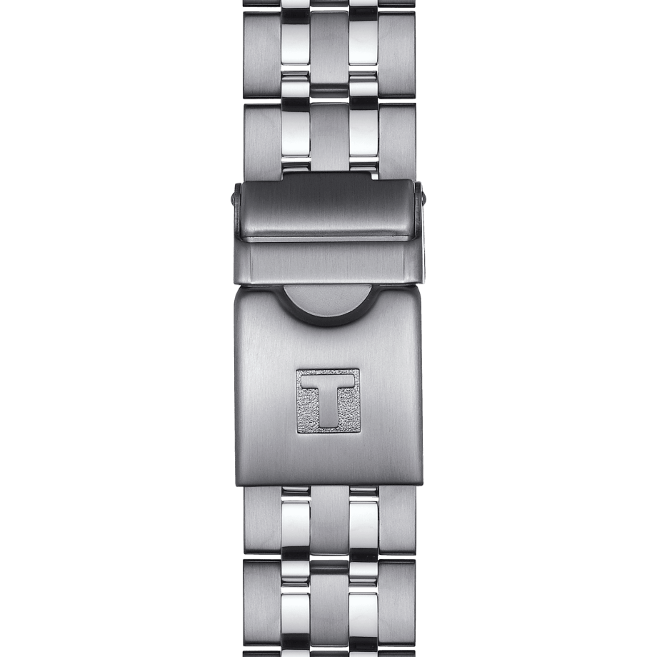 - Completing the look is a stainless steel bracelet. The strap closes with a folding clasp with push-buttons.