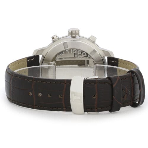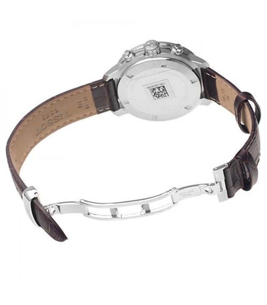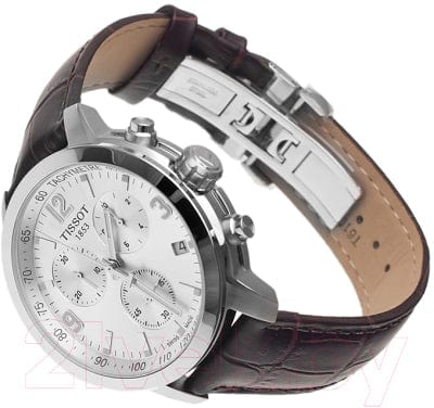 Stainless steel case with a brown leather strap. Fixed stainless steel bezel. White dial with luminous silver-tone hands and index hour markers. Arabic numerals mark the 3, 9 and 12 o'clock positions. Minute markers. Tachymeter around the outer rim. Dial Type: Analog. Luminescent hands and markers. Date display at the 4 o'clock position. Chronograph - three sub-dials displaying: 60 second, 30 minute and 1/10th of a second. Quartz movement. Scratch resistant sapphire crystal. Screw down crown. Solid case back. Case diameter: 41 mm. Case thickness: 12 mm. Round case shape. Band width: 19 mm. Butterfly clasp. Water resistant at 200 meters / 660 feet. Functions: chronograph, tachymeter, date, hour, minute, second. Casual watch style. Watch label: Swiss Made. Tissot PRC 200 Chronograph White Dial Brown Leather Men's Watch T0554171601701.