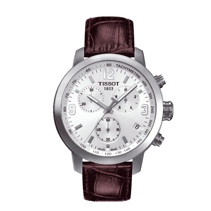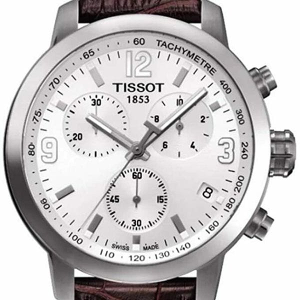 Tissot PRC 200 mens watch with stainless steel case with a brown leather strap. Fixed stainless steel bezel. White dial with luminous silver-tone hands and index hour markers. Arabic numerals mark the 3, 9 and 12 o'clock positions. Minute markers. Tachymeter around the outer rim. Casual watch style. Watch label: Swiss Made.