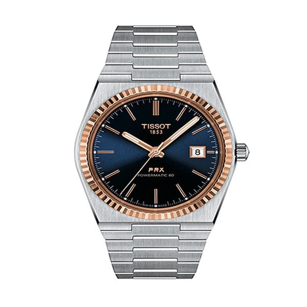 316L stainless steel case with a stainless steel bracelet. Fixed fluted 18kt rose gold bezel. Blue dial with luminous rose gold-tone hands and index hour markers. Minute markers around the outer rim. Dial Type: Analog. Luminescent hands and markers. Date display at the 3 o'clock position. Tissot calibre Powermatic 80 (C07.111) automatic movement, based upon ETA 2824-2, containing 23 Jewels, bitting at 21600 vph, and has a power reserve of approximately 80 hours. Scratch resistant sapphire crystal. Pull / push crown. Transparent case back. Tonneau case shape. Case size: 40 mm. Case thickness: 10.9 mm. Butterfly clasp with a push -buttons release. Water resistant at 100 meters / 330 feet. Functions: date, hour, minute, second. Prx Powermatic 80 Series. Casual watch style. Watch label: Swiss Made. Tissot PRX Powermatic 80 Automatic Blue Dial Men's Watch T931.407.41.041.00.