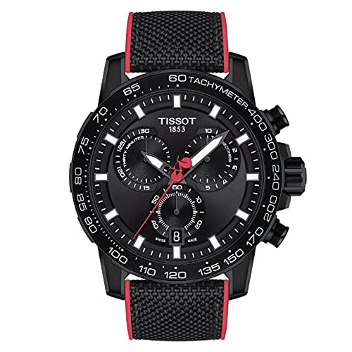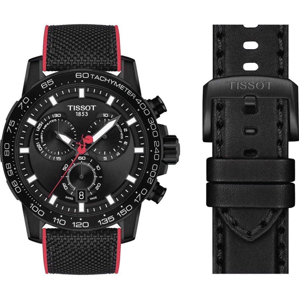 Brand New Authentic Tissot Supersport Chrono Giro Ditalia Black Dial Leather Strap Men's Watch Model T125.617.37.051.00. Stainless Steel with Black PVD Coating case with Black Calfskin Leather strap. Tang clasp. Aluminum bezel. Dial description: Black Hands and Index hour markers with minute markers around the outer rim and 3 sub-dials on a Black dial. Quartz movement. Calendar: Date at 6 o'clock. Chronograph sub-dials display: 1/10th of a Second, 60 Second, 30 Minute. Powered by Tissot Caliber ETA G10.212 engine. Watch functions: Date, Hour, Minute, Second, Chronograph, Battery End Of Life Indicator. Scratch Resistant Sapphire crystal. Round case shape. Case size: 45.5mm. Case thickness: 11.9mm. Solid case back. 100 Meters - 330 Feet water resistant. 2 year warranty. Also known as model: T1256173705100.
