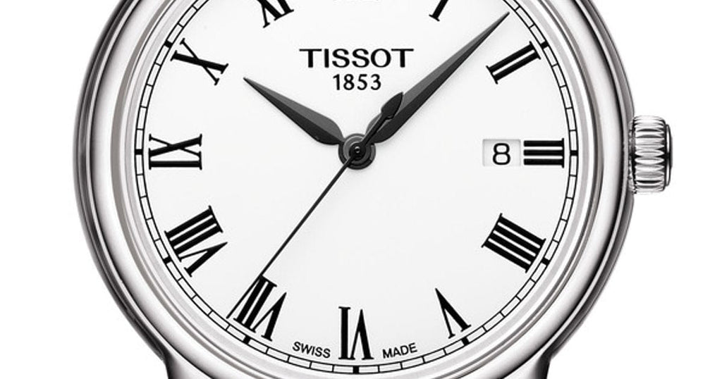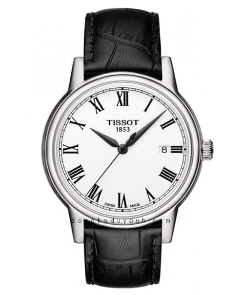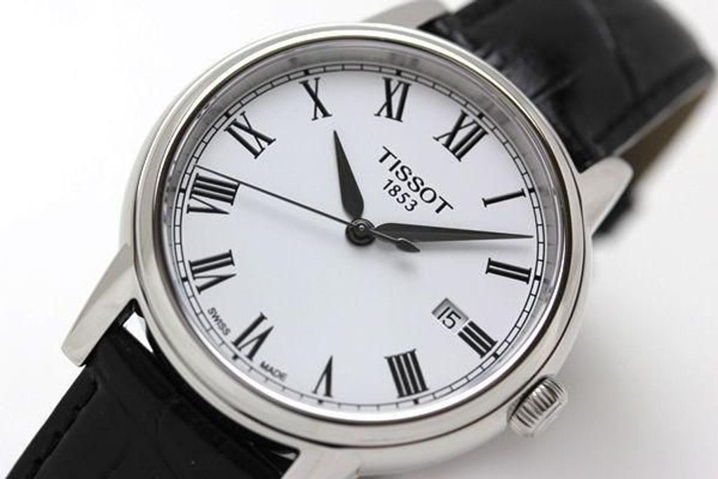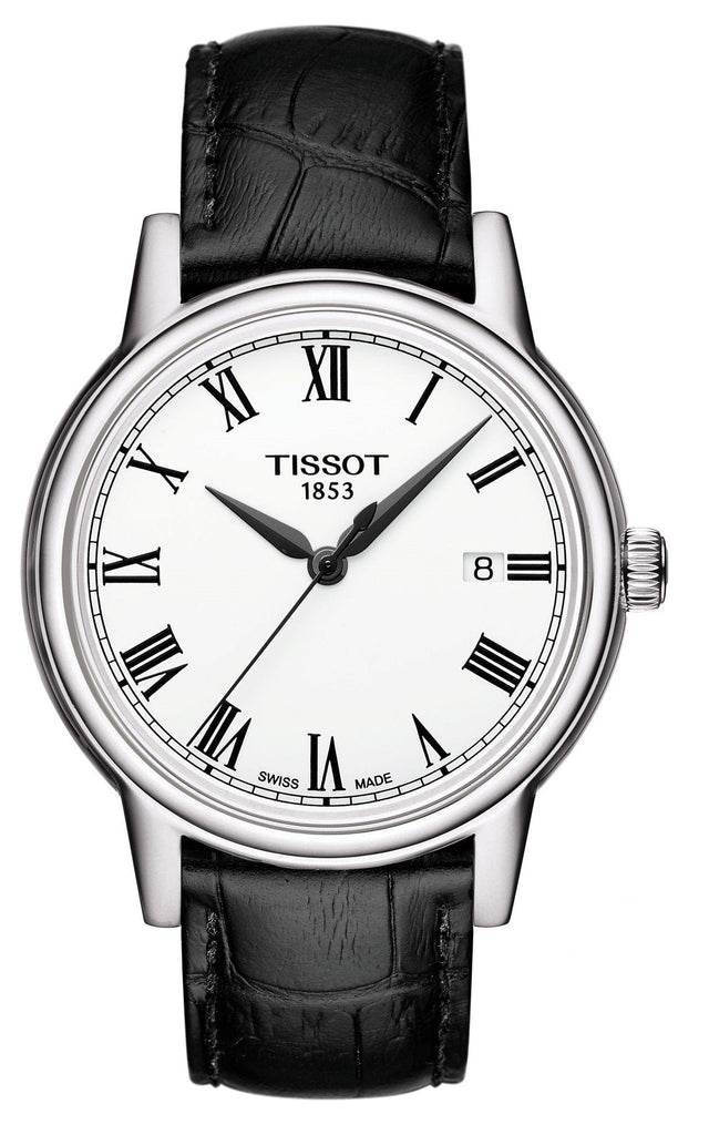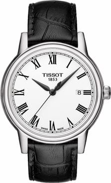 Brand New Authentic Tissot T-Classic Carson White Dial Leather Strap Men's Watch Model T085.410.16.013.00. Stainless Steel case with Black Leather strap. Tang clasp. Fixed bezel. White dial. Battery Operated Quartz movement. Scratch Resistant Sapphire crystal. Case size: 40mm. Case thickness: 8.35mm. Solid case back. 30 Meters - 100 Feet water resistant. 2 year warranty. Tissot keeps things simple with this beautiful T-Classic Carson. The white dial is pristine and makes use of the space as an aesthetic, resisting any temptation to overcomplicate things. The roman numeral markers are large and stately, and the dark sword-shaped hands cut through the minutes and hours like a knife through cream. The black leather strap provides a spectacular contrast to the silver case and white dial. This is a watch for gentlemen. Also known as model: T0854101601300.