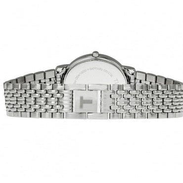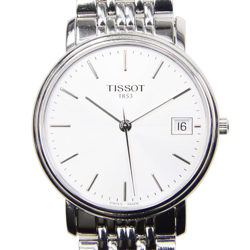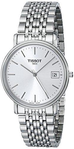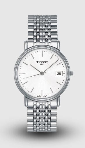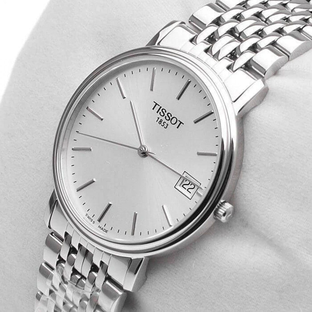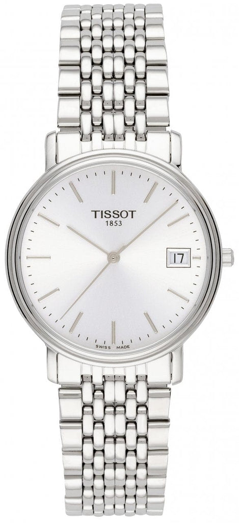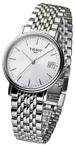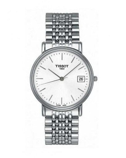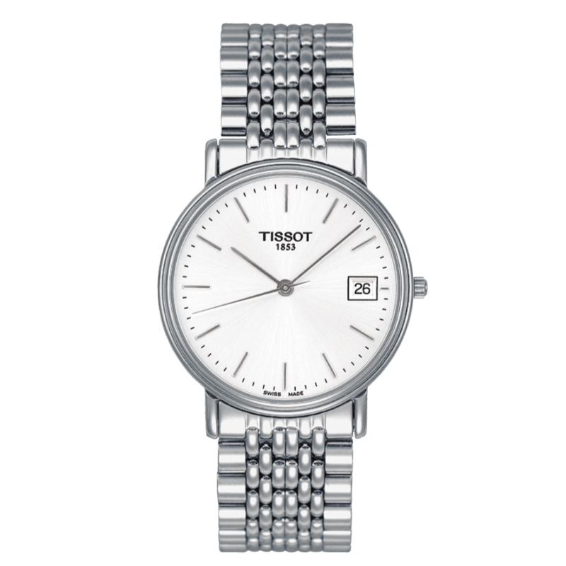 Stainless steel case with a stainless steel bracelet. Fixed stainless steel bezel. Silver dial with silver-tone hands and index hour markers. Minute markers around the outer rim. Dial Type: Analog. Date display at the 3 o'clock position. Quartz movement. Scratch resistant sapphire crystal. Pull / push crown. Solid case back. Case diameter: 34 mm. Case thickness: 6 mm. Round case shape. Band width: 20 mm. Deployment clasp. Water resistant at 30 meters / 100 feet. Functions: date, hour, minute, second. Casual watch style. Watch label: Swiss made. Tissot T-Classic Desire Men's Watch T52.1.481.31.
