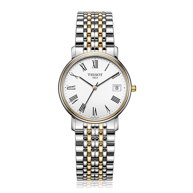 Stainless steel case with a two-tone (silver and gold-tone) stainless steel bracelet. Fixed gold-tone bezel. Silver dial with black hands and Roman numeral hour markers. Minute markers around the outer rim. Dial Type: Analog. Date display at the 3 o'clock position. Quartz movement. Scratch resistant sapphire crystal. Solid case back. Case diameter: 34 mm. Deployment clasp. Water resistant at 30 meters / 100 feet. Functions: date, hour, minute, second. Dress watch style. Watch label: Swiss made. Tissot T-Classic Desire Mens Watch T52.2.481.13.