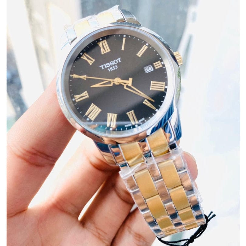 Brand New Authentic Tissot T-Classic Classic Dream Two Tone Men's Fashion Watch Model T033.410.22.053.01. Stainless Steel case with Two-Tone Stainless Steel watch band. Deployment with Push Button clasp. Fixed bezel. Dial description: Yellow gold tone hands and Roman Numeral hour markers on a Black dial. Quartz movement. Powered by ETA Caliber 805.112 engine. Watch functions: Date, Hour, Minute, Second. Pull/Push crown. Scratch Resistant Sapphire crystal. Round case shape. Case size: 38mm. Case thickness: 7.4mm. Solid case back. 30 Meters - 100 Feet water resistant. 2 year warranty. Also known as model: T0334102205301, T033-410-22-053-01.