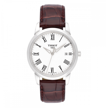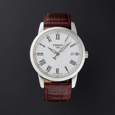 Silver-tone stainless steel case with a brown leather strap. Fixed silver-tone stainless steel bezel. White dial with silver-tone hands and black Roman numeral hour markers. Minute markers around the outer rim. Dial Type: Analog. Date display at the 3 o'clock position. ETA Caliber 805.112 quartz movement. Scratch resistant sapphire crystal. Pull / push crown. Stainless steel case back. Case size: 38 mm. Case thickness: 8 mm. Round case shape. Band width: 19 mm. Band length: 7.5 inches. Tang clasp. Water resistant at 30 meters / 100 feet. Functions: date, hour, minute, second. Dress watch style. Watch label: Swiss Made. Item Variations: T0334101601300. Tissot T-Classic Dream White Dial Men's Watch T033.410.16.013.00.
