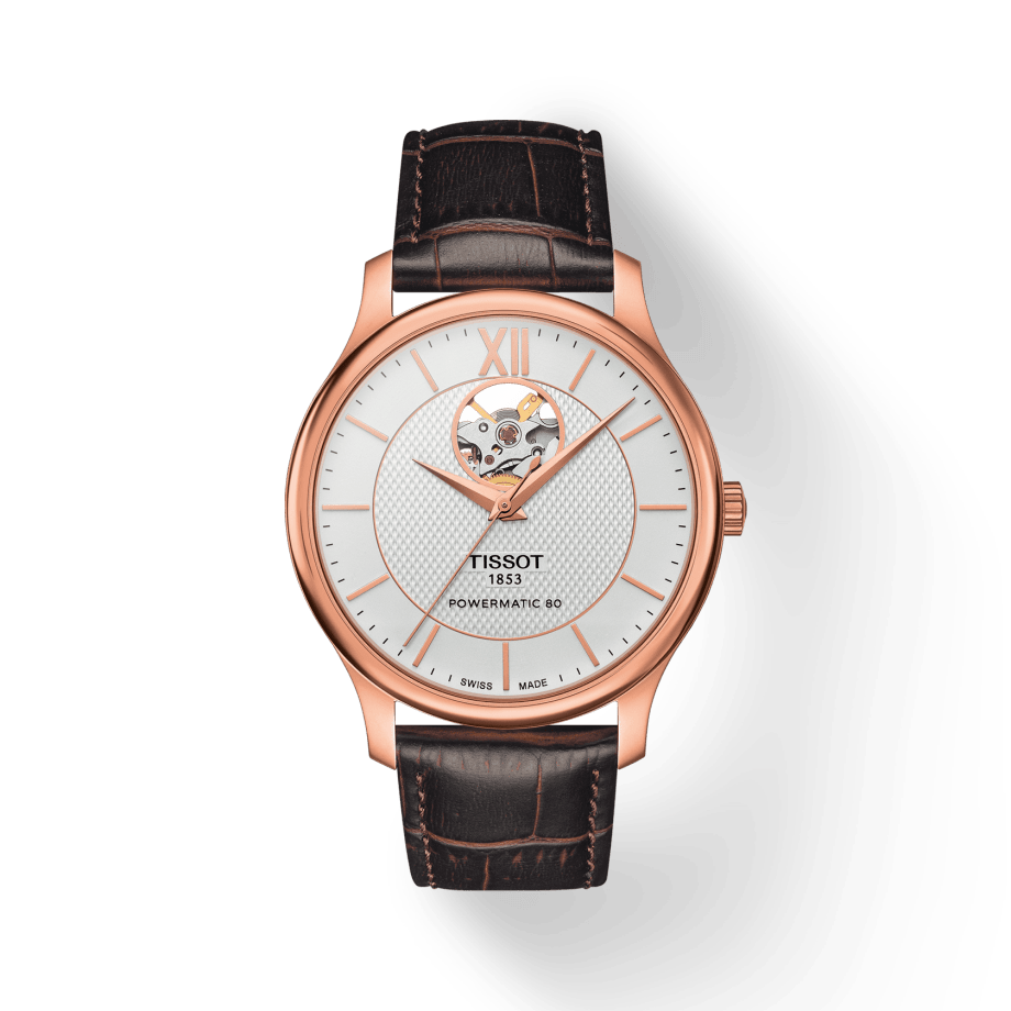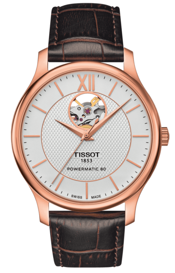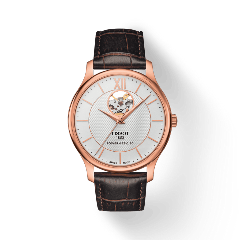 Tissot Tradition Powermatic 80 Open Heart Silver Dial Brown Leather Strap Watch For Men - T063.907.36.038.00