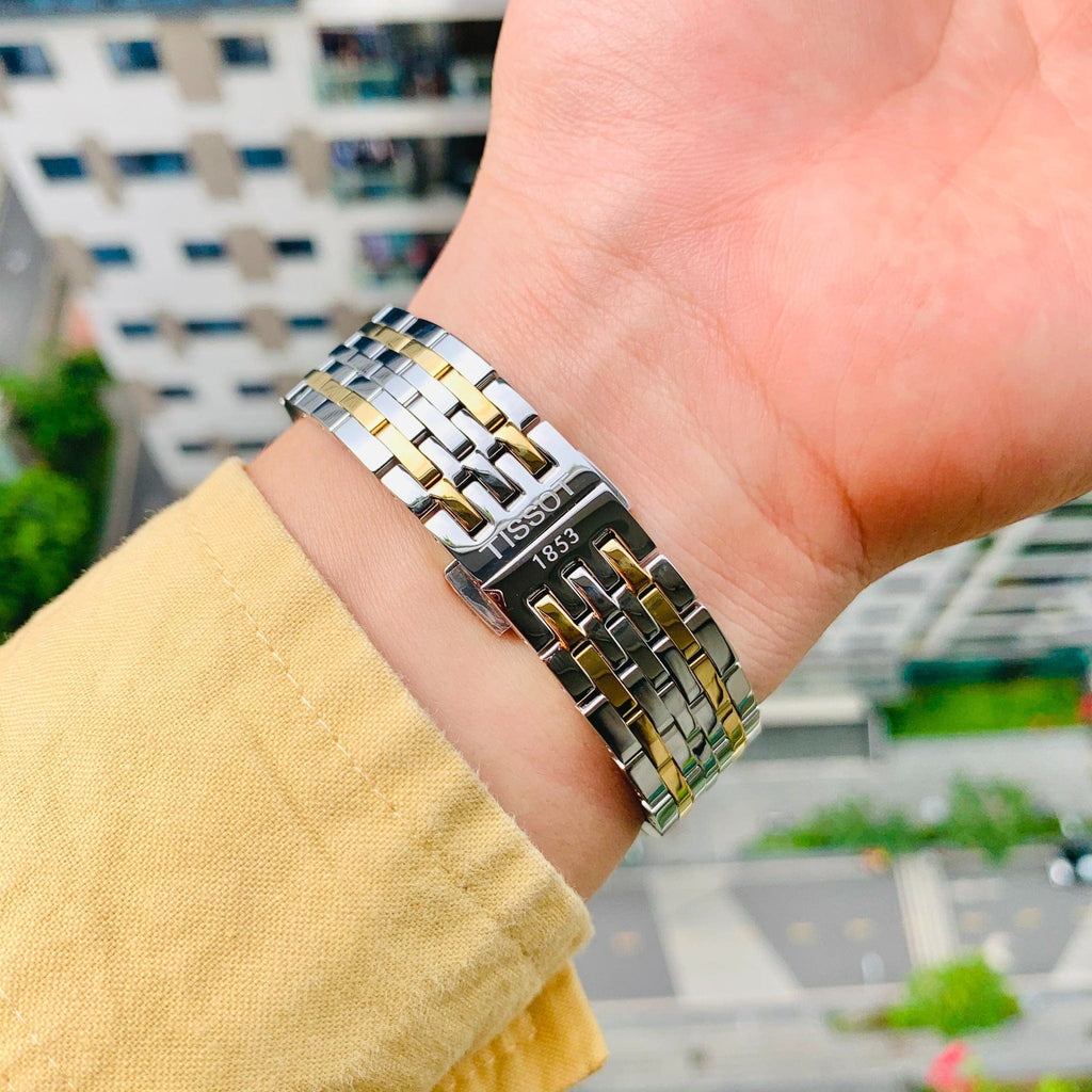 The name Le Locle seems to be a reliable ingredient of success. As well as being the name of Tissot's home and heritage, nestled in the Swiss Jura Mountains, it is the name of a hugely popular automatic watch family. The models display exquisite elegance with details such as Roman numerals and a traditional Le Locle signature which complete the picture of classical chic. Two tone stainless steel with yellow gold PVD coating case and bracelet, silver dial. Case size 39.3mm. Butterfly clasp with push-buttons. Scratch-resistant sapphire crystal. Water resistannce upto 30 meters. Automatic movement.