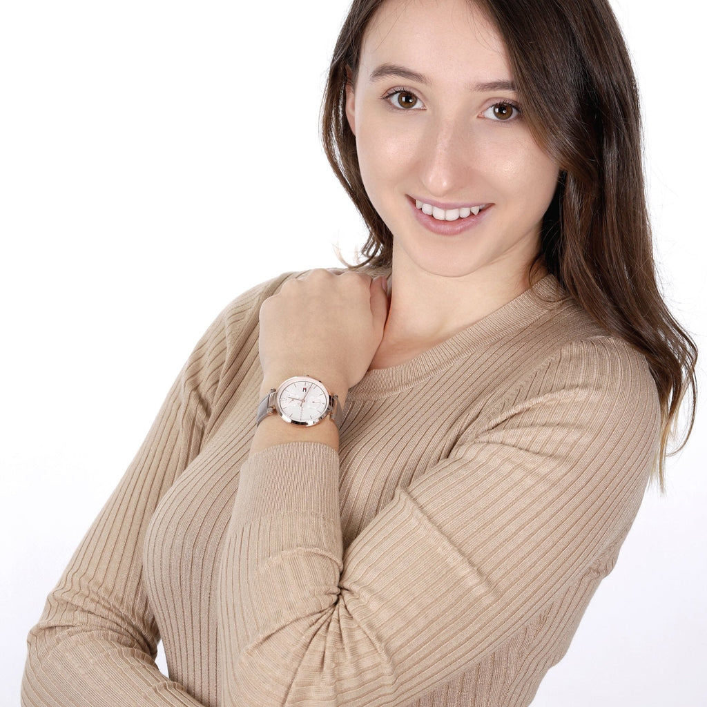 Elegant, simple and fashionable watch that is suitable for the daily life of every women -the watch has a calendar function: day-date High quality 19 cm length, 14 mm wide, Grey Leather strap with a buckle Case diameter: 36 mm, case height: 8 mm and case color: Rose gold dial color: silver Water resistant: 3 bars- weight: 36 grams The watch is delivered in an original gift box and has a warranty of 2 years