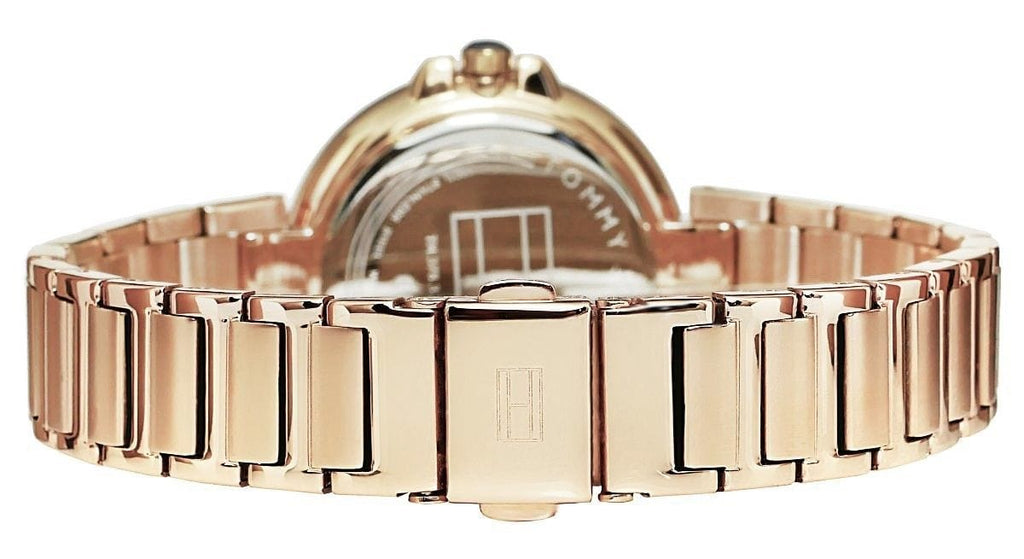 Pull / push crown. Solid case back. Round case shape, case size: 37.19 mm. Fold over clasp with a safety release. Water resistant at 30 meters / 100 feet. Functions: date, day, hour, minute, second. Dress watch style. Tommy Hilfiger Quartz Ladies Watch 1782127.