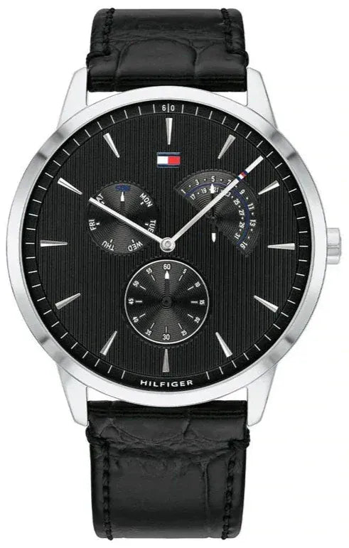 The Tommy Hilfiger 1710391 men's watch is an ideal choice for men who value original style. The black dial of the watch is covered with shatter-resistant mineral glass. The belt is made of natural black leather. The Tommy Hilfiger timepiece is distinguished by silver-colored details.